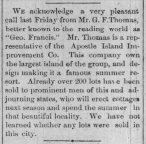 This is the third post in a series featuring The Ashland News items about La Pointe’s infamous Judge John William Bell, written mainly by his son-in-law George Francis Thomas née Gilbert Fayette Thomas a.k.a G.F.T. In today’s post we explore stories about real estate transactions negotiated between Judge Bell and Julius Austrian.