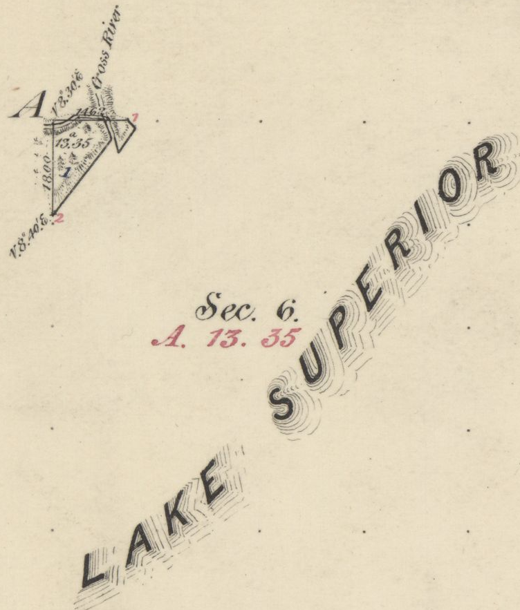 Map of “Tract embraced in blue lines reserved by order of President of 25 September 1855 to be withdrawn from market and reserved for the Ontonagon Band of Chippewa Indians“ on a “low sand beach & good fishing ground”.