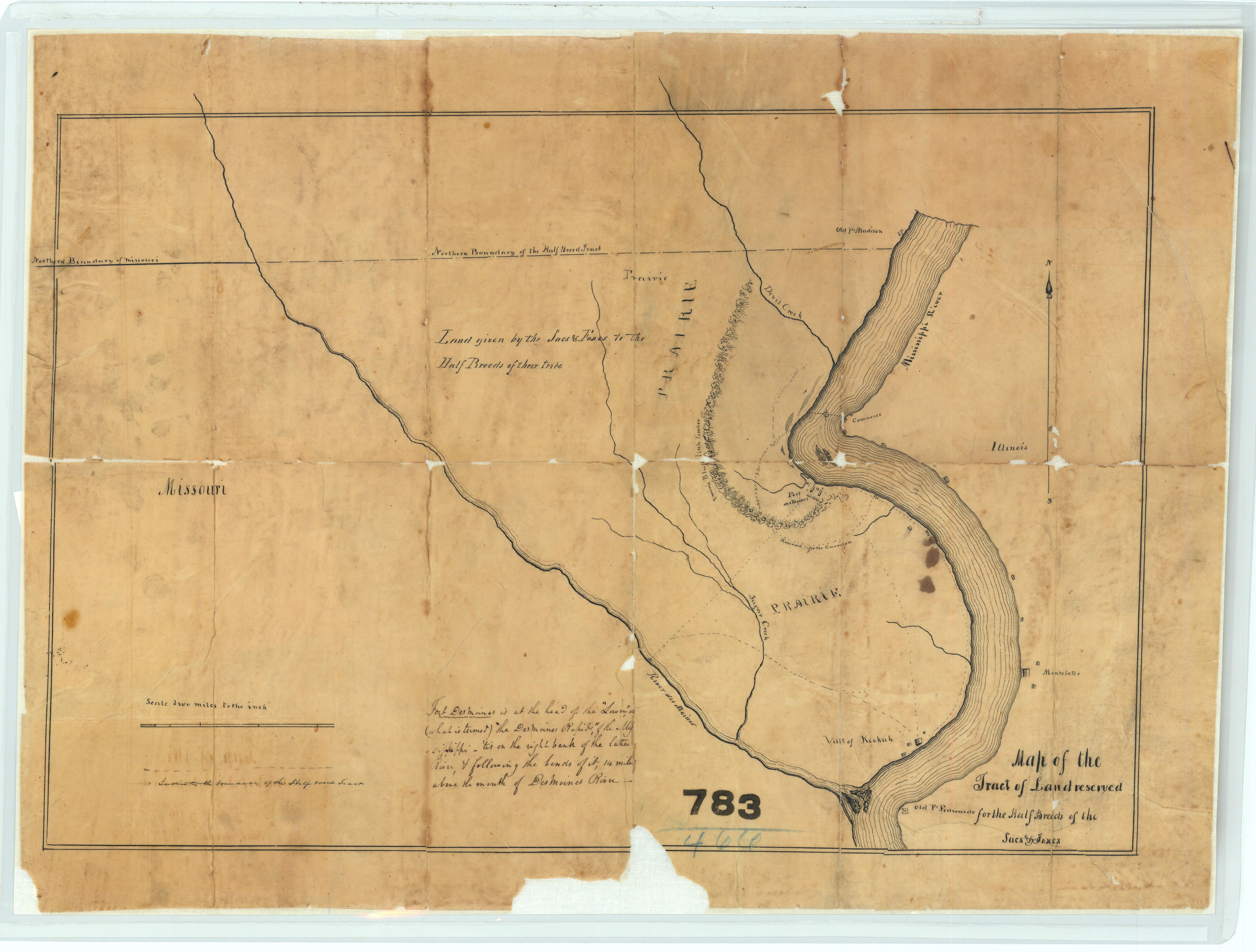 “This map is further titled ‘Land given by the Sacs and Foxes to the Half-Breeds of their tribe.’ This map also shows Fort Desmoines and portions of the Des Moines River and the Mississippi River.”
