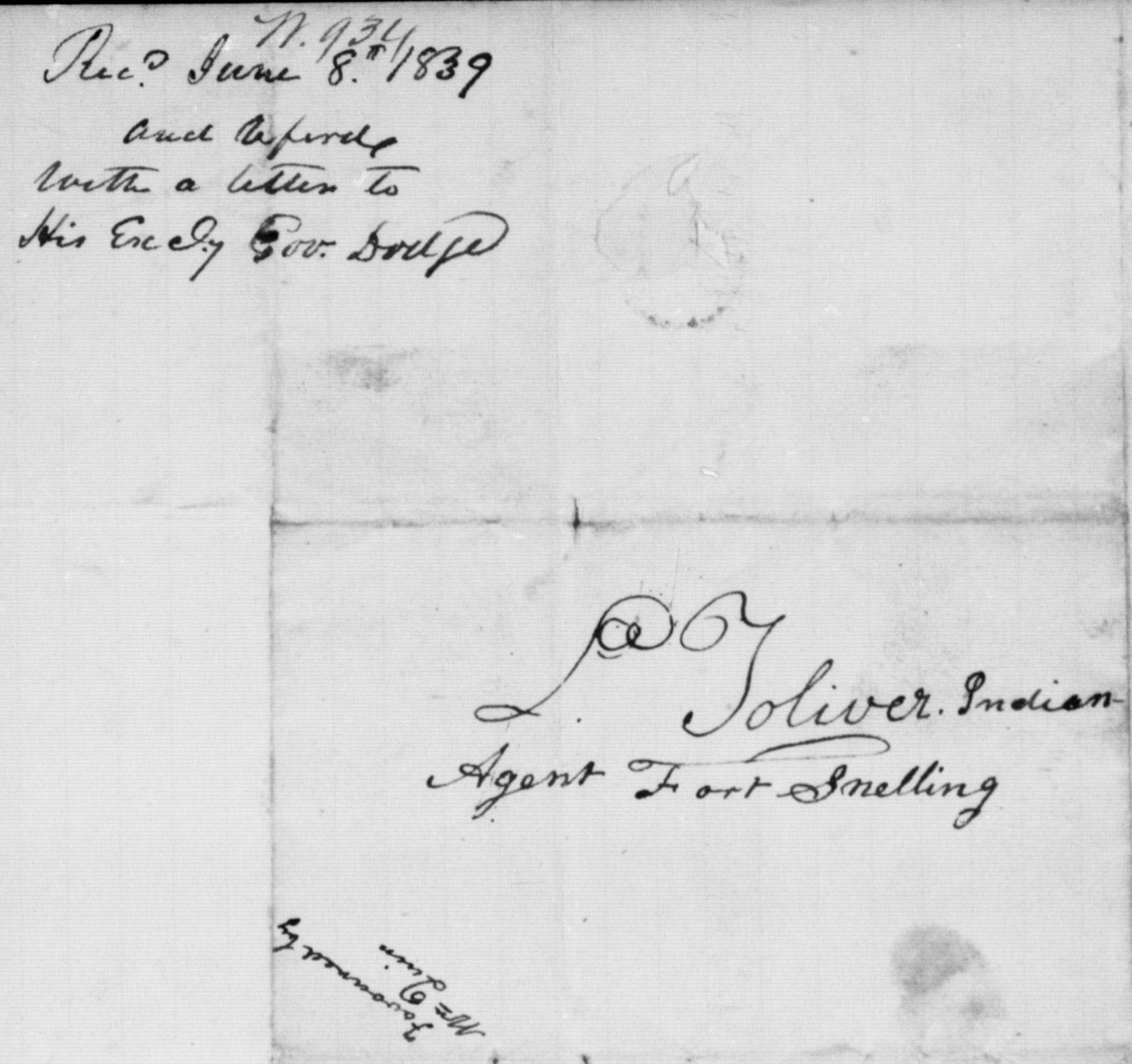 We now wish Maj Toliver; to mention to your children that it is a fals report that we had any intention to have more difficulty with the Sioux, as our Missionaries can attest as far as they understand us. We will be at the Fort in seventeen days to pay you a friendly visit as soon as we received the news; we sent expressed to our brethren to meet us at the mouth of Rum Riv. and accompany us to the Fort.