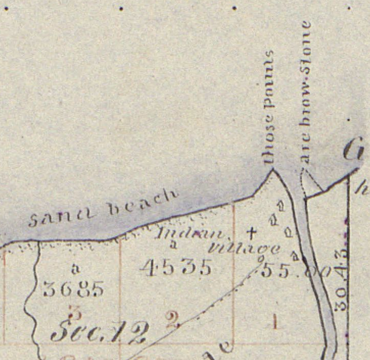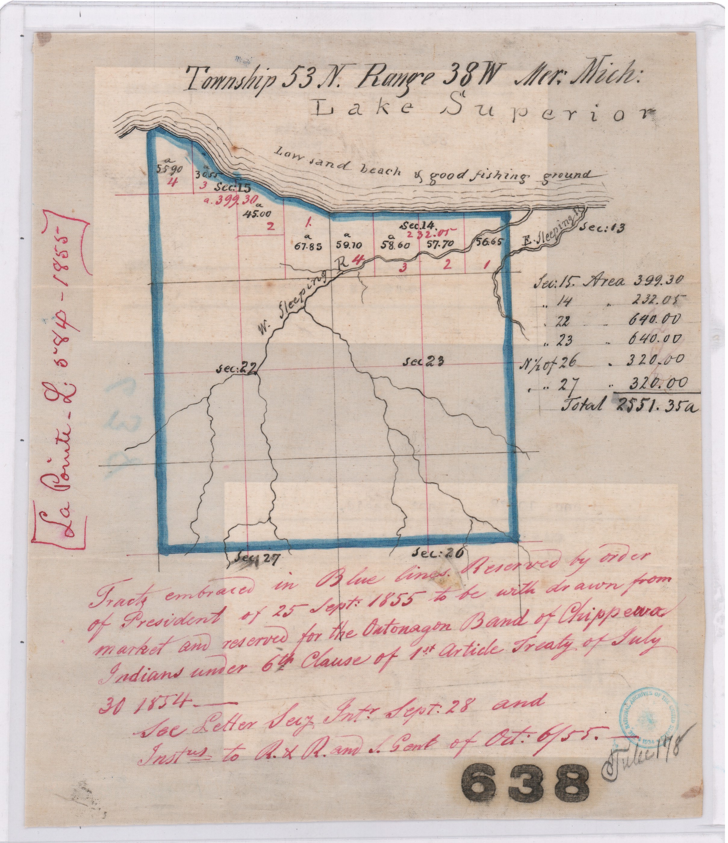 Map of “Tract embraced in blue lines reserved by order of President of 25 September 1855 to be withdrawn from market and reserved for the Ontonagon Band of Chippewa Indians“ on a “low sand beach & good fishing ground”.