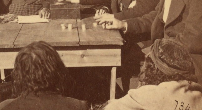 According to the Library of Congress: “Cherokee payments(?). Several men seated around table counting coins; large group of Native Americans stand in background.” Published 1870-1900 (more info).