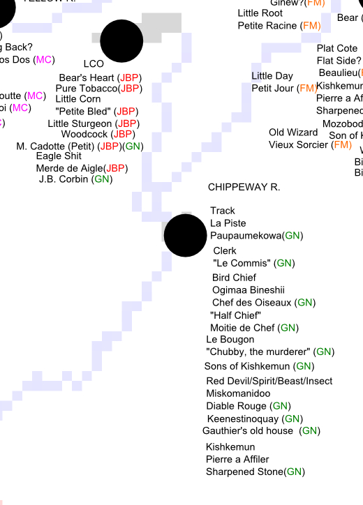I started with Perrault’s Narrative and tried to record all the names the traders and voyageurs mentioned as well. As they were mobile and much less identified with particular villages, I decided this wasn’t worth it. However, because this is Chequamegon History, I thought I should at least record those “Frenchmen” (in quotes because they were British subjects, some were English speakers, and some were mix-bloods who spoke Ojibwe as a first language) who left their names in our part of the world. So, you’ll see Cadotte, Charette, Corbin, Roy, Dufault (DeFoe), Gauthier (Gokee), Belanger, Godin (Gordon), Connor, Bazinet (Basina), Soulierre, and other familiar names where they were encountered in the journals. I haven’t tried to establish a complete genealogy for either, but I believe Perrault (Pero) and Malhoit (Mayotte) also have names that are still with us.