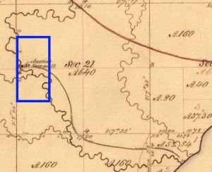 Roughly 80 acres are highlighted in blue, labeled as “Austrian’s Sawmill“ on the 1852 PLSS survey map. This is located along what is now Pike’s Creek south of the Bayfield Road on the mainland.