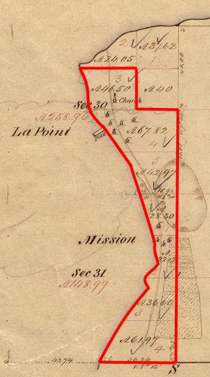 The lots of this deed are outlined in red, describing La Pointe (New Port and Middleport) for a total of 306.28 acres. This is roughly 80 acres short of “Containing 382 23/100 Acres of land”.