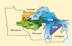Tribes of the 1854 Chippewa Treaty in Michigan and Wisconsin have won two important lawsuits in recent years due to the fact that their tribal lands should have been reserved under the 1854 Treaty of La Pointe instead of becoming “checkerboarded” from illegal taxation/foreclosures.