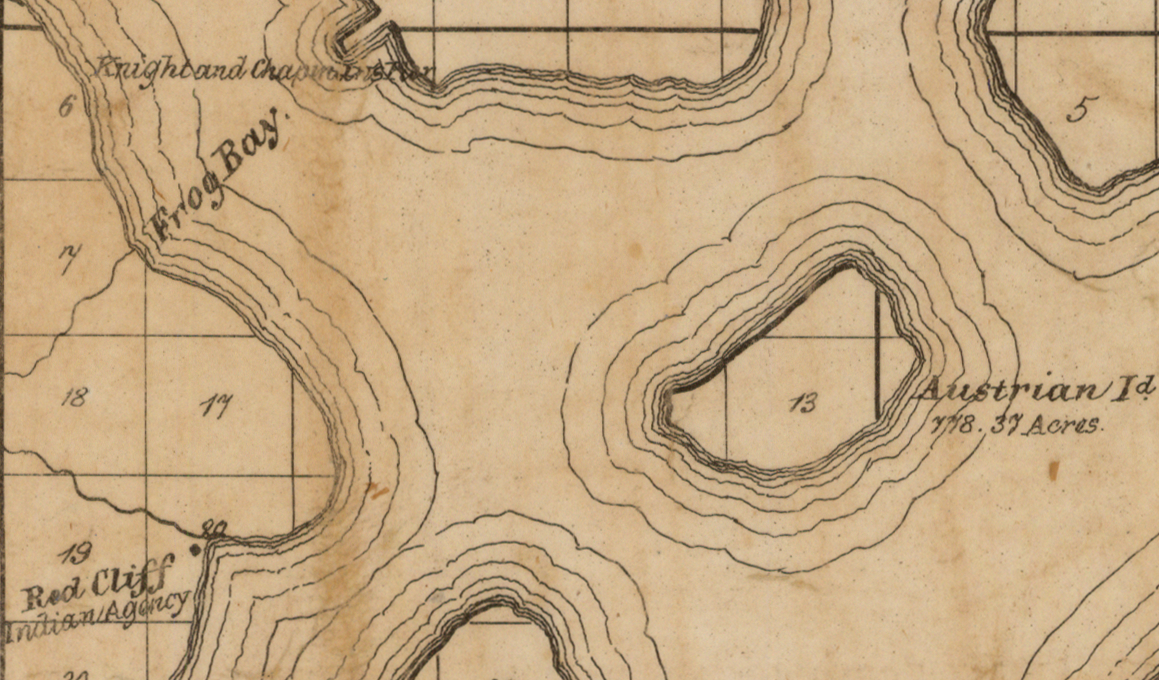 Austrian Island on Asaph Whittlesey’s 1871 map of Apostle Islands and Harbor of Bayfield and Its Surroundings.