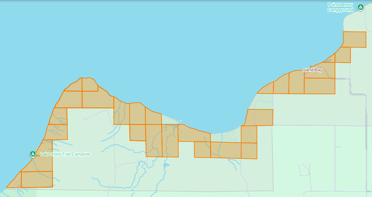 The Apostle Islands National Lakeshore’s Mainland Unit contains 29 Allotments (roughly 1,550 acres) located at the Red Cliff Reservation (a.k.a. Gaa-miskwaabikaang).  The Sand Bay shoreline contains three Allotments (uncolored) that are owned by Red Cliff.