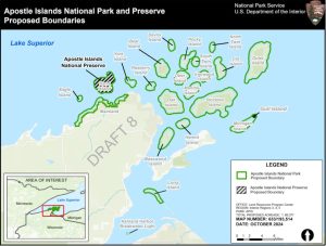 The Chequamegon area’s Apostle Islands National Lakeshore has been in the news lately due to the reintroduction of Congressman Tom Tiffany’s proposed Apostle Islands National Park and [Sand Island] Preserve Act.  This proposed Act has been controversial due to strong opposition from local governments citing lack of consultation and insufficient infrastructure, among other concerns.