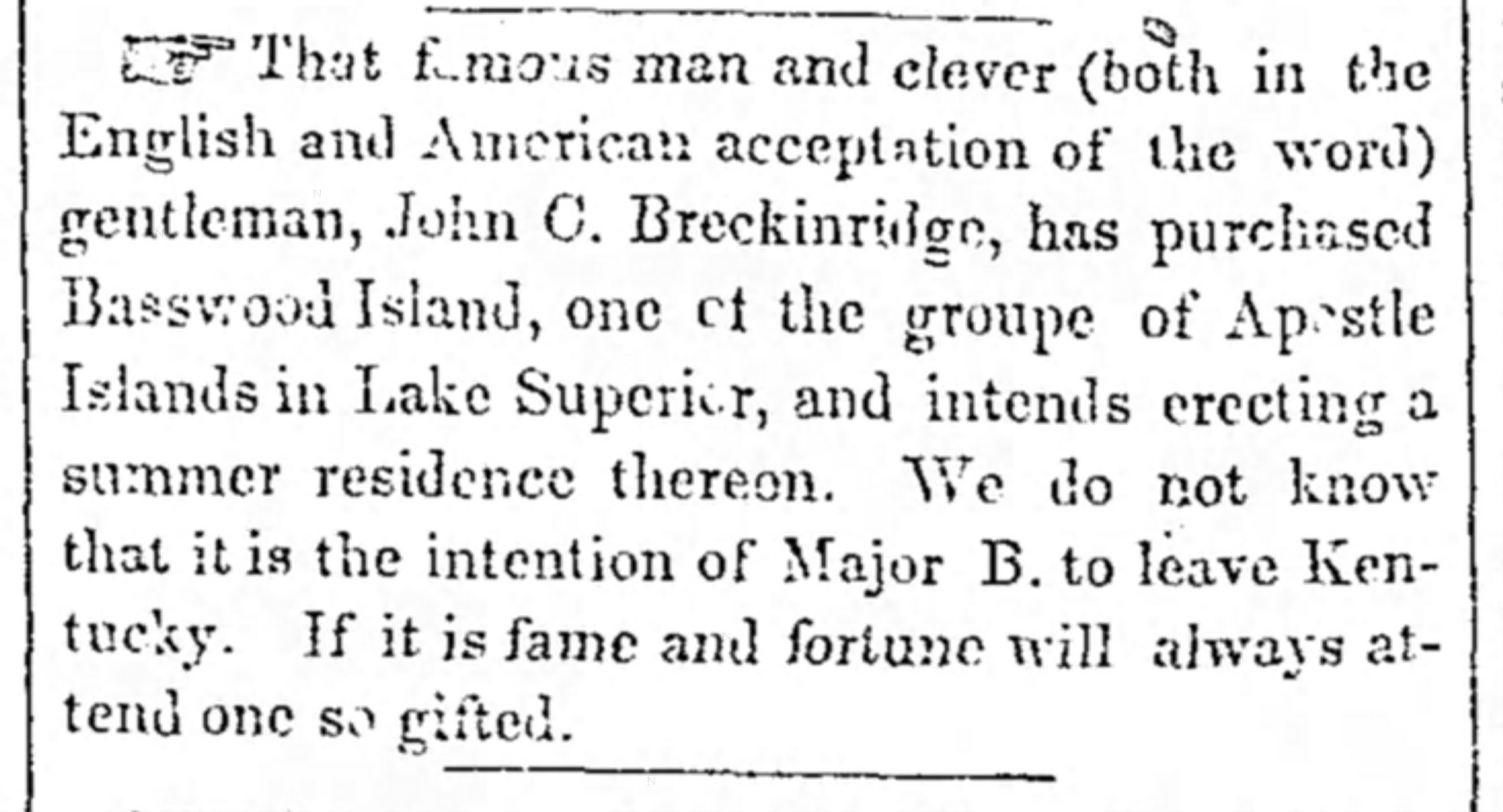 In a previous post we briefly mentioned that the infamous John Breckenridge made national news with his land speculation on Basswood Island immediately following the 1854 Treaty of La Pointe.  In a few short years Breckinridge would become Vice President of the United States, and also a Confederate States Army brigadier general during the Civil War.