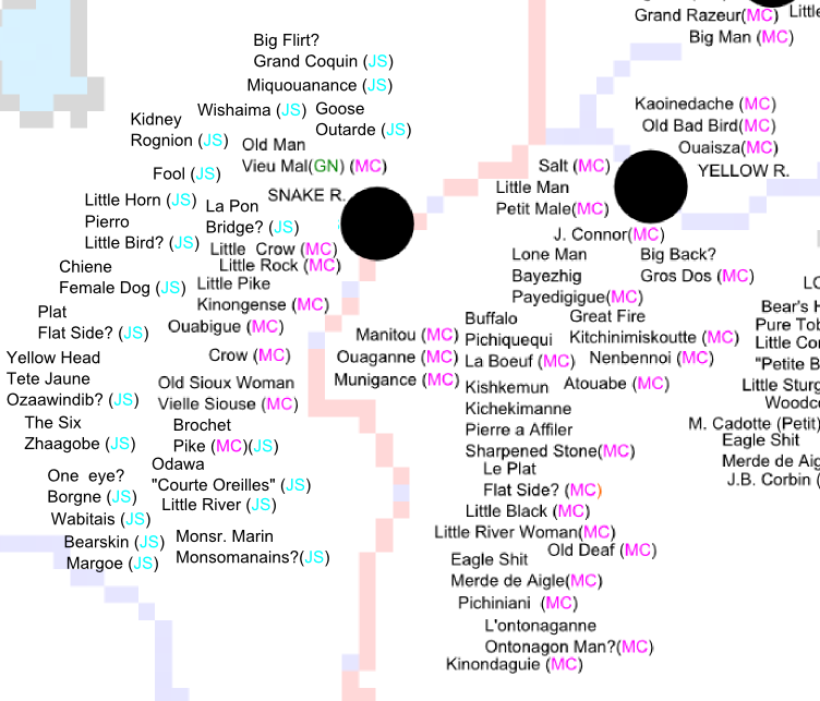 On March 8th, I posted a map visually laying out the names of Ojibwe people and certain traders and voyageurs who appeared in the journals and narratives of Perrault, Curot, Nelson, and Malhoit. These four men traded during years of fierce competition between the North West Company (Perrault, Malhoit), and the upstart XY Company (Nelson, Curot), at the dawn of the 19th-century. These were British companies, working on American-claimed territory, but they mostly employed French-Ojibwe mix blood and French-Canadians. These were violent and turbulent times, but they are valuable to written history because the competition led the companies to require journals from their clerks and traders.