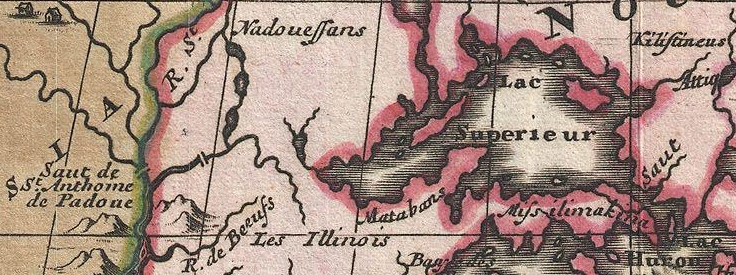 1698 detail of Saint Anthony’s Falls and Lake Superior from Amerique Septentrionalis Carte d’un tres grand Pays entre le Nouveau Mexique et la Mer Glaciace Dediee a Guilliaume IIIe. Roy de La Grand Bretagne Par le R. P. Louis de Hennepin Mission: Recol: et Not: Apost: Chez c. Specht a Utreght 1698.